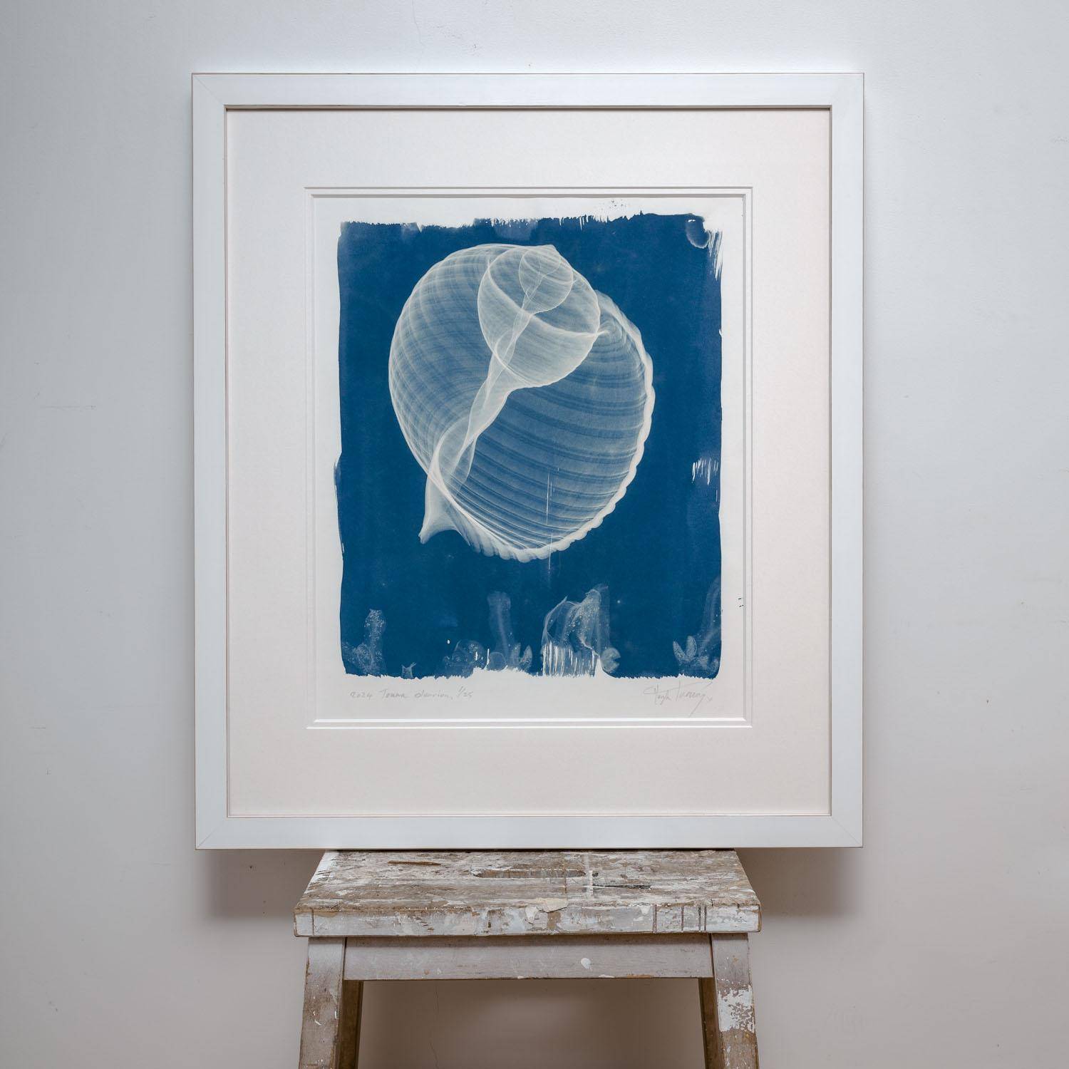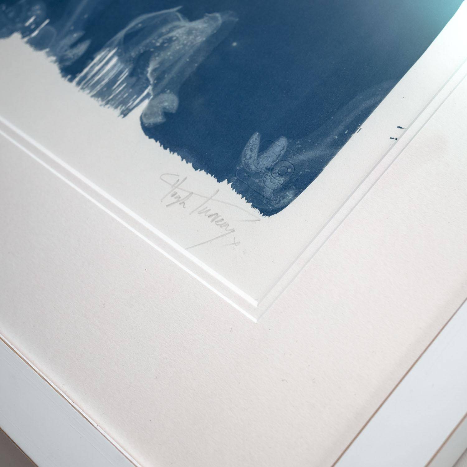 25 limited edition, showcase the amazing technical combination of the 2 contact photographic processes: x-ray and cyanotype. The images are first created with x-ray film and then craft printed onto 300gsm archival paper, using the UV light from the sun. Every print is unique due to the bespoke nature of the application of the cyanope chemicals to the paper. The prints are archival double-mounted and framed behind non-reflective ARTGLASS AR 70. Each print is signed, dated, titled by the artist and is also supplied with a blockchain Certificate of Authenticity via Verisart.